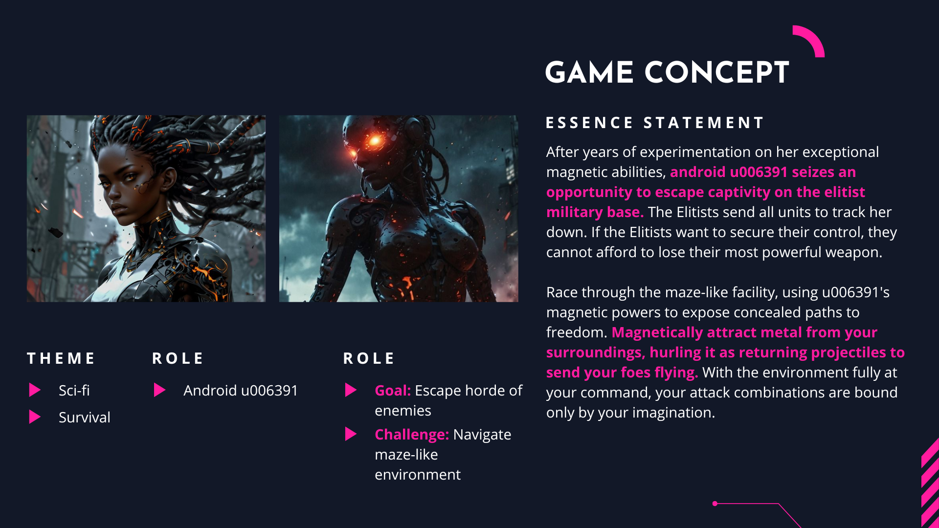 The goal of sprint 1 was to brainstorm and pitch gameplay concept ideas and to pick an area of focus for the rest of the sprints. The first idea was to focus on using magnetic abilities for navigation and exploring a space. The second concept was focused on combat and how to use magnetic abilities to escape a horde of enemies. Presentation feedback suggested combining both ideas into 1 gameplay concept that explored using magnetism for both platforming and attacking enemies.